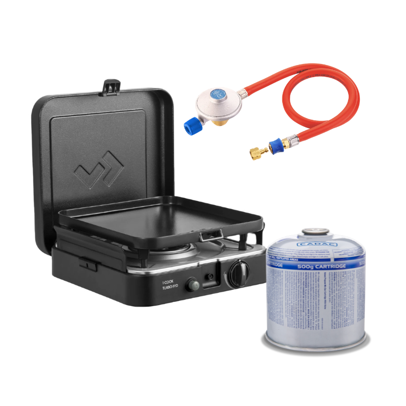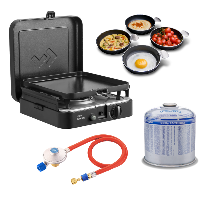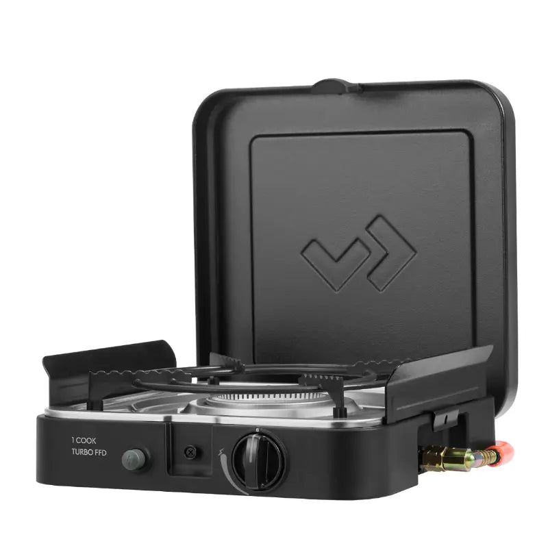 1 Cook Turbo FFD is a versatile stove for indoor and outdoor cooking. Featuring a powerful Turbo Burner, reliable heat output is guaranteed even in windy conditions. Safety is ensured with the integrated Flame Failure Device that automatically turns off the gas if the flame goes out. Complete with a ceramic-coated grill plate, pan holder, coffee pot stand, and windshields, this portable cooking system offers convenience and flexibility. Includes a secure locking lid and a durable carry bag.