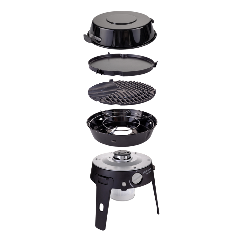 The Cadac Safari Chef 30 HP Deluxe is a lightweight, compact outdoor cooker weighing under 4.5kg and packing 24% smaller than earlier models. It features multiple cooking surfaces, including a ceramic BBQ grid and flat grill plate, plus an enamelled dome lid that doubles as a pot. Easy-to-use tabs simplify switching plates, while the built-in piezo ignition offers reliable flame control. Perfect for camping, picnics, and fishing, it folds neatly with marked legs and stores in a durable bag for effortless transport and setup.