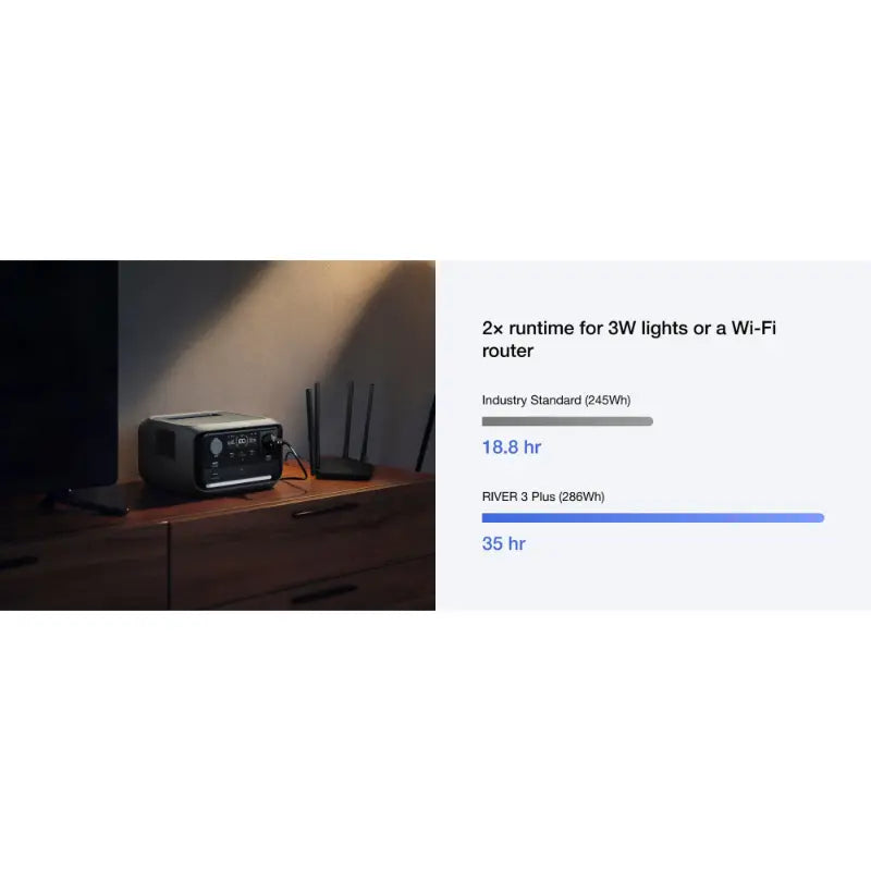 - Up to 2x runtime for light-wattage appliances: refers to tests using a 3W light or Wi-Fi router.