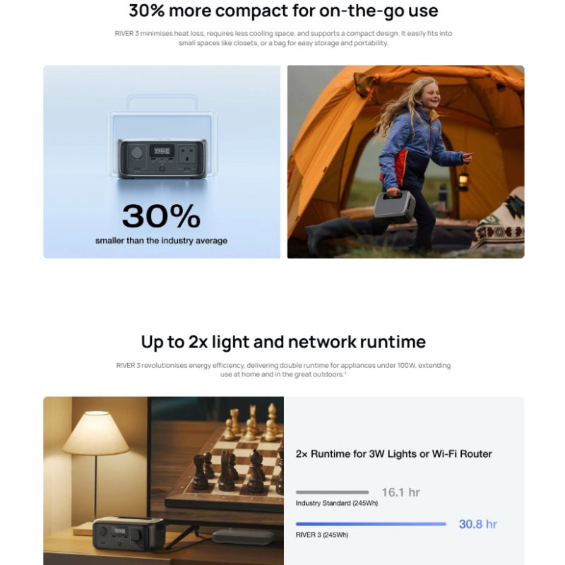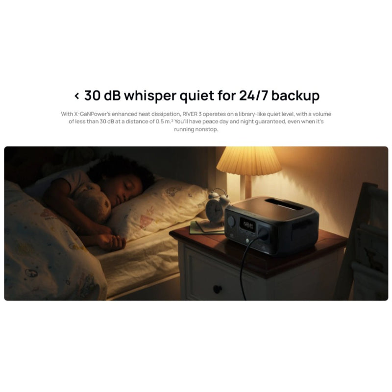 The EcoFlow River 3 UPS bundle features a 245 Wh LiFePO₄ power station delivering 300 W continuous power and up to 600 W with X-Boost. It charges fully in one hour and switches to backup power in under 20 ms to protect your devices. The durable, portable unit has an IP54 rating and a long-lasting battery. Included is a lightweight, foldable 45 W Type-C solar panel with 25% efficiency and IP68 protection, ideal for charging on the move. This bundle offers fast, reliable power for camping, remote work, or home backup.