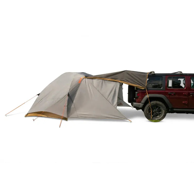 Need to protect yourself from the elements while also having easy access to your vehicle? Look no further than our Kelty Caboose 4! This ingenious shelter easily attaches to your car's open hatch, creating a convenient free-standing tent and extra rumpus room. With Kelty Quick-Corners and a Shark-Mouth duffle, setup is a breeze and you'll be ready to hit the road in no time. Plus, the extended awning can also be used as a massive vestibule when not connected to your car. Stay warm and comfortable no matter where the adventure takes you!