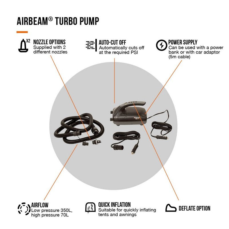The Vango AirBeam Turbo Pump is our most powerful pump, ensuring quick and easy pitching. The motor has been designed for quick inflation, especially when used on our Single Point Inflation tents and awnings. Attach to a car adaptor for power with a 5 metre cable. With multiple nozzle options, plastic feet for stability, and auto cut-off to prevent over-inflation, this is the only pump you need.
