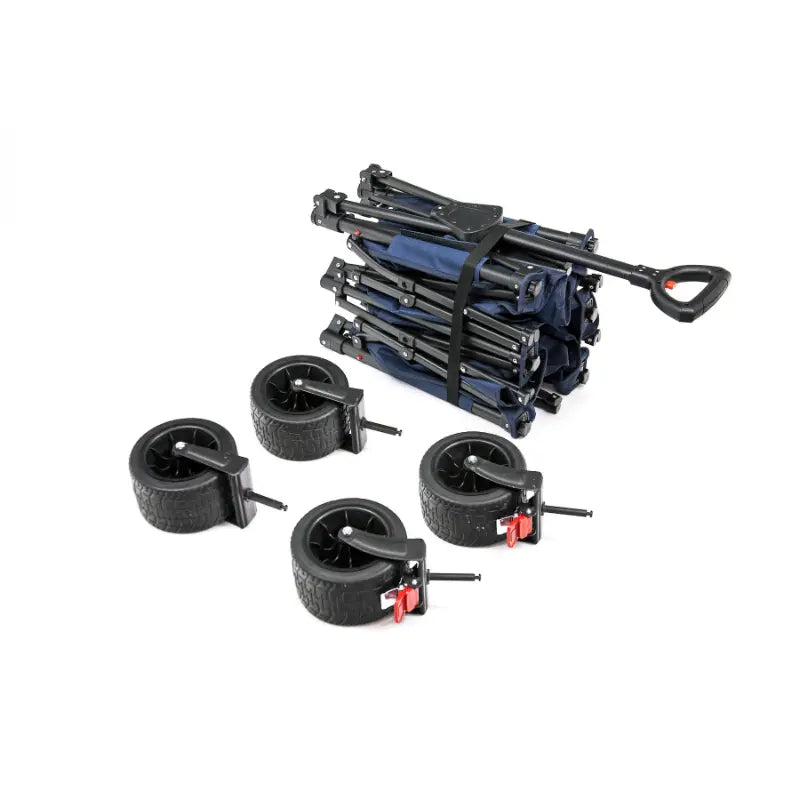 The Outdoor Revolution Camping Wagon is a sturdy folding trolley, designed to carry all the kit that you need for a family day out at the beach, picnics or for around the camp site. Fitted with extra wide robust detachable wheels that won’t sink into sand or mud and are fitted with a very handy brake to stop the trolley rolling away when stationary. The concertina frame system folds down to a compact size in a handy carry bag for storage and transportation.