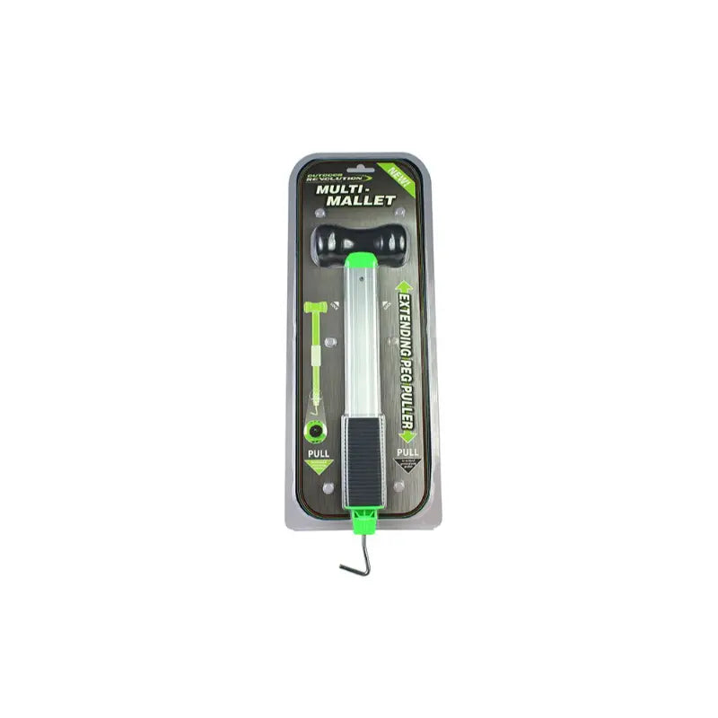 Outdoor Revolution's 'Multi-Mallet Blister Pack' is a technical mallet with multi-functional features, making it a must-have camping accessory for all outdoor enthusiasts! The weighted rubber mallet head makes light work of knocking pegs into harder or stoney ground, whilst the ergonomic plastic handle ensures superb grip; the handle is fully-extendable, helping to prevent back-ache, typically caused by bending over when extracting pegs. This conveniently retracts back into its alloy handle when not in use. It incorporates a peg puller on the end of the handle in order to make unpegging a more convenient and speedy process; a convenient peg brush cleaner can be accessed to clean up those dirty pegs before putting them away.