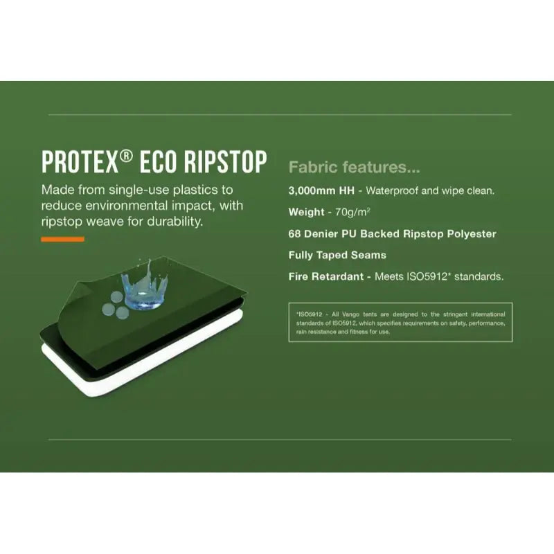 - Protex Eco 68D Ripstop Flysheet: Made from recycled single-use plastics with a waterproof 3000 mm HH rating.