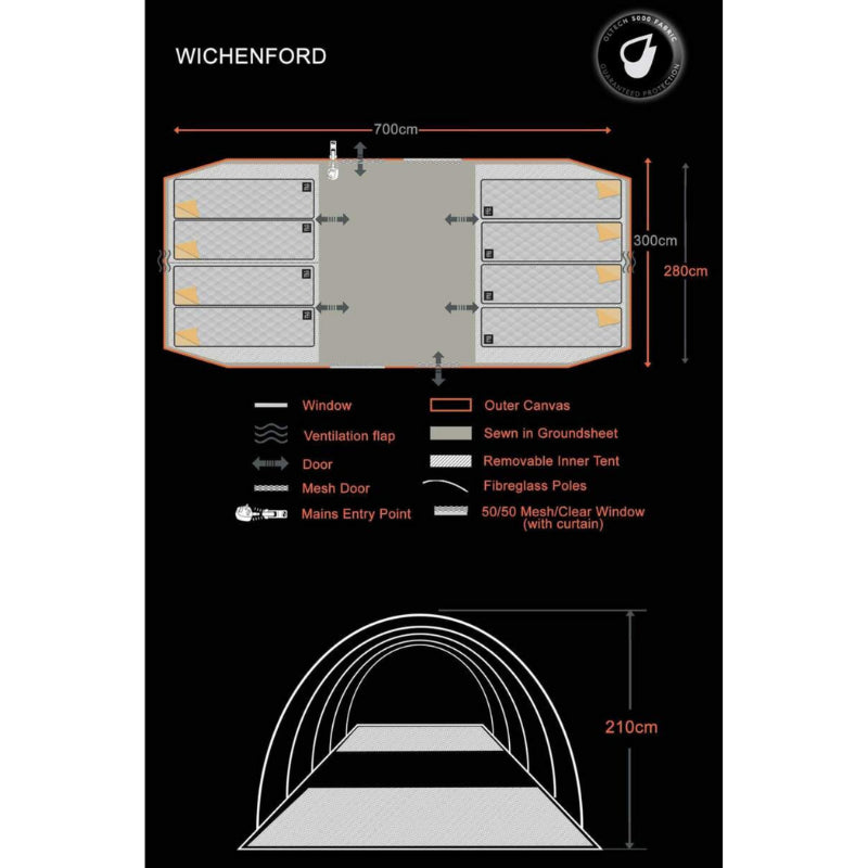 The Wichenford 8.0 is our largest poled tent. Offering ample space, the Wichenford 8.0 Tent is suitable for sleeping up to 8 people, making it perfect for going away with a large family or a big group of friends for a weekend away or to a festival.